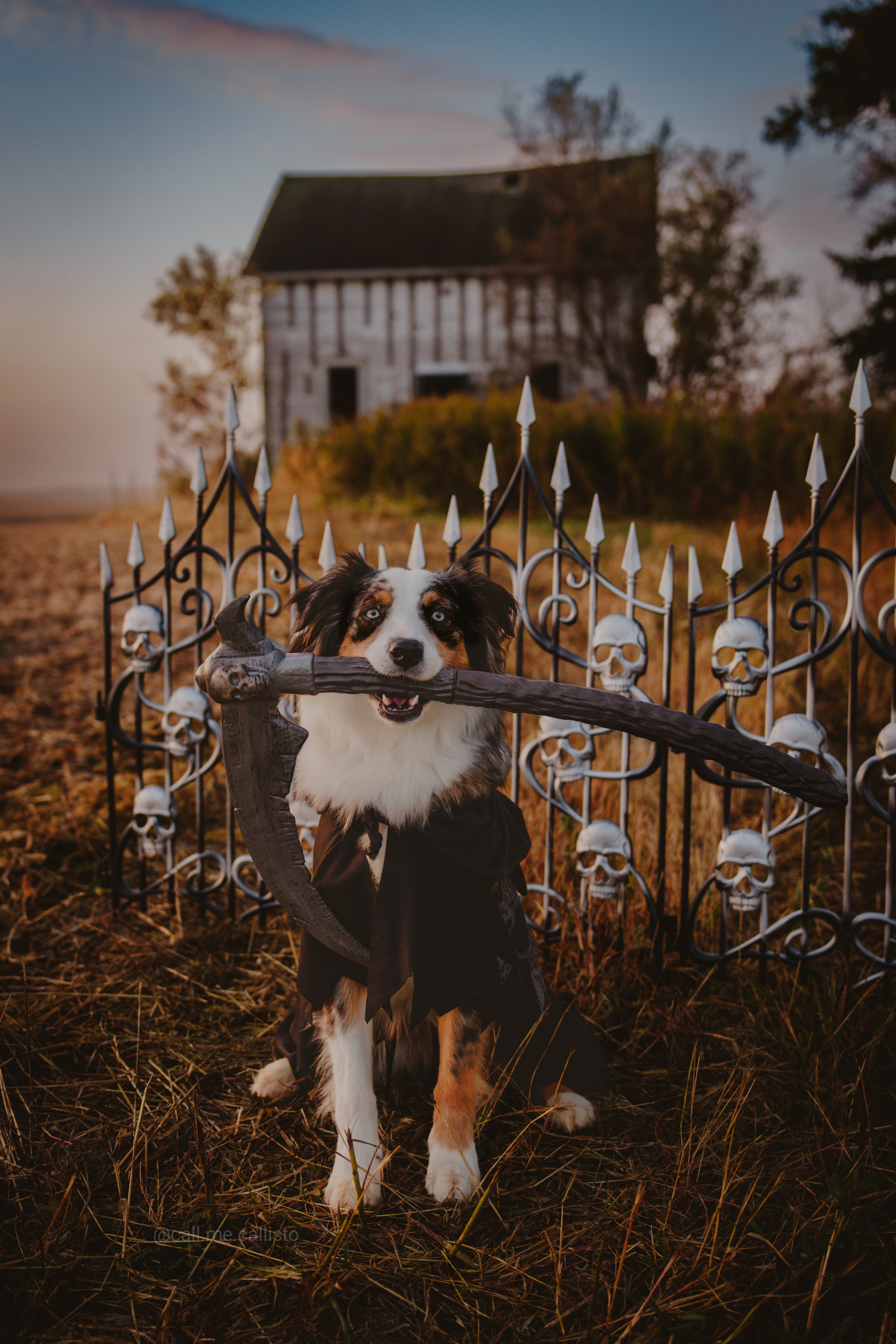 Callisto is a two year old Australian Shepherd who learned how to hold things in her mouth specifically for this costume.