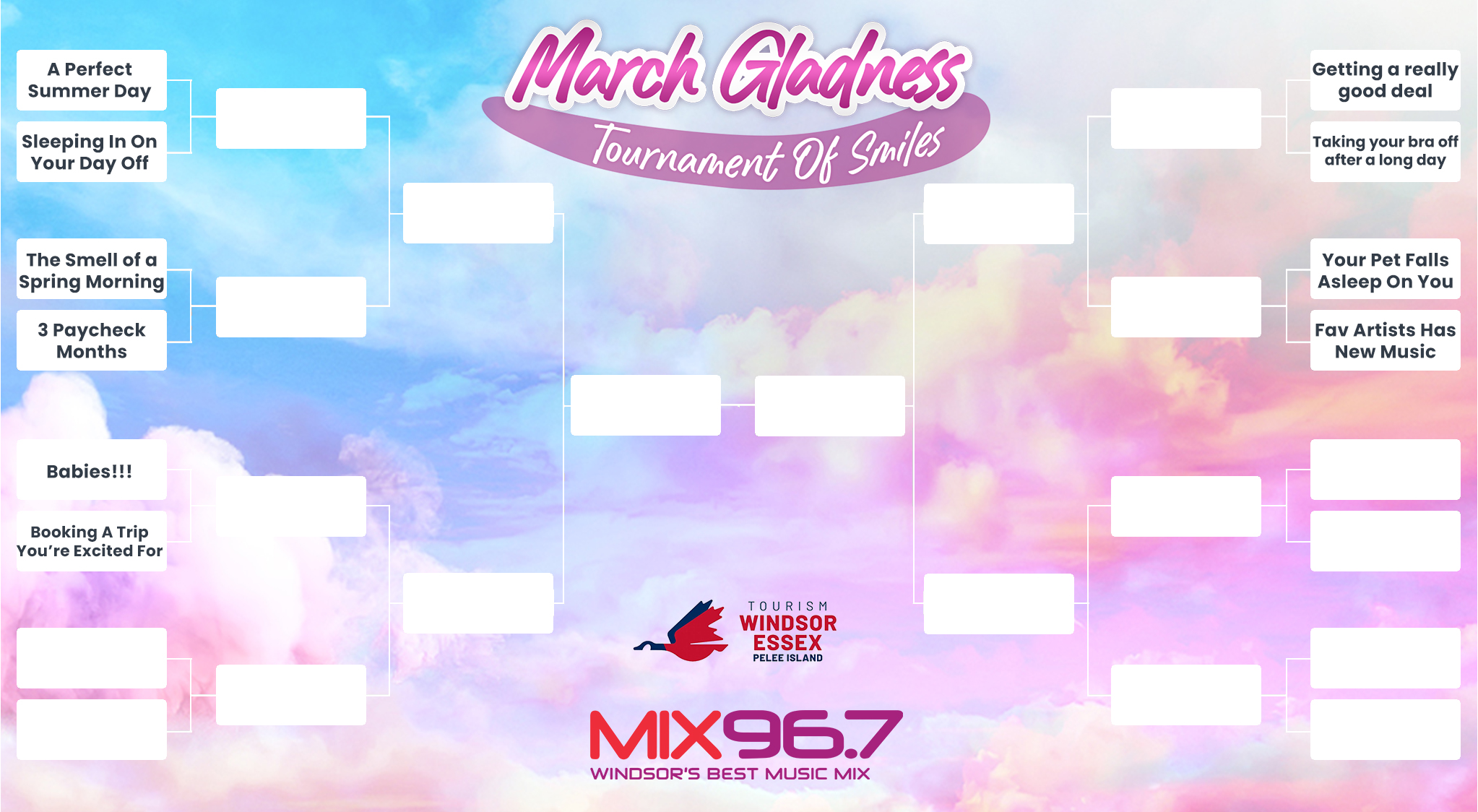 Listen and play along with Jay & Tori each weekday morning in the Tourism Windsor Essex Pelee Island “Tournament of Smiles” bracket! Voting will happen on the Mix Facebook page.
