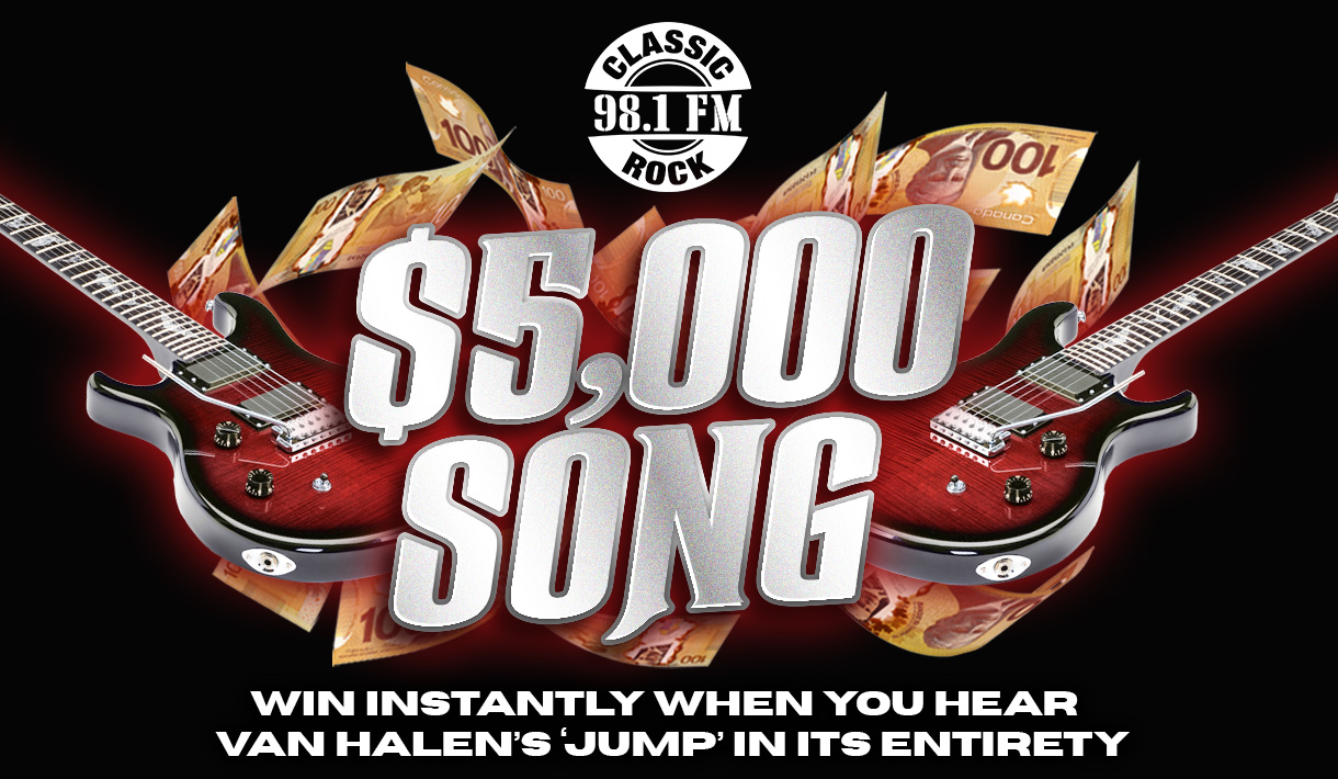 The $5000 Song you will listen for this contest is Van Halen’s ‘JUMP’ from the album 1984. No other versions (including live versions will count towards the contest). Contestants must listen for ‘JUMP’ in its entirety. They must hear all of the song and when they do, they will text JUMP to the Classic Rock Text Line at 519-679-3733. Texter 98 will win $5000.00 CDN. If less than 98 people text in, a random draw will be made from all people who texted JUMP. Contest players must text only the word JUMP (no punctuation or additional words) to qualify for the contest.