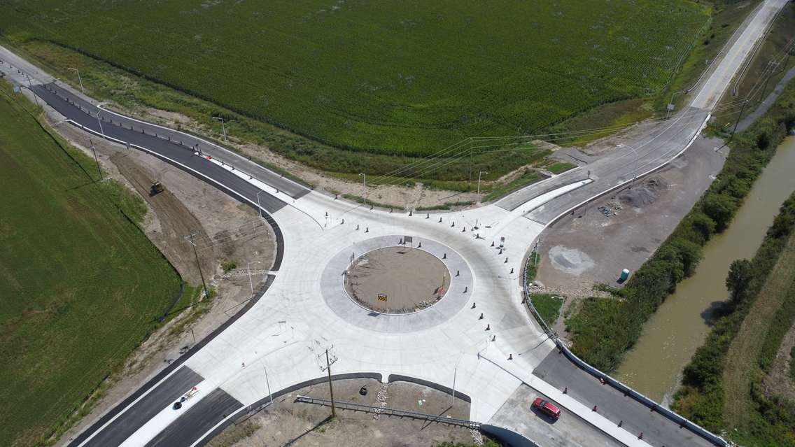The new roundabout was recommended following safety studies and has been built to accommodate larger vehicles, including transport trucks and farm equipment, consistent with other rural single-lane roundabouts in Ontario. The intersection features a mountable curb and concrete apron on the inside, as well as a mountable curb and paved shoulder at the entries and exits, providing the needed width for oversized vehicles. The total cost for the project was $6 million.