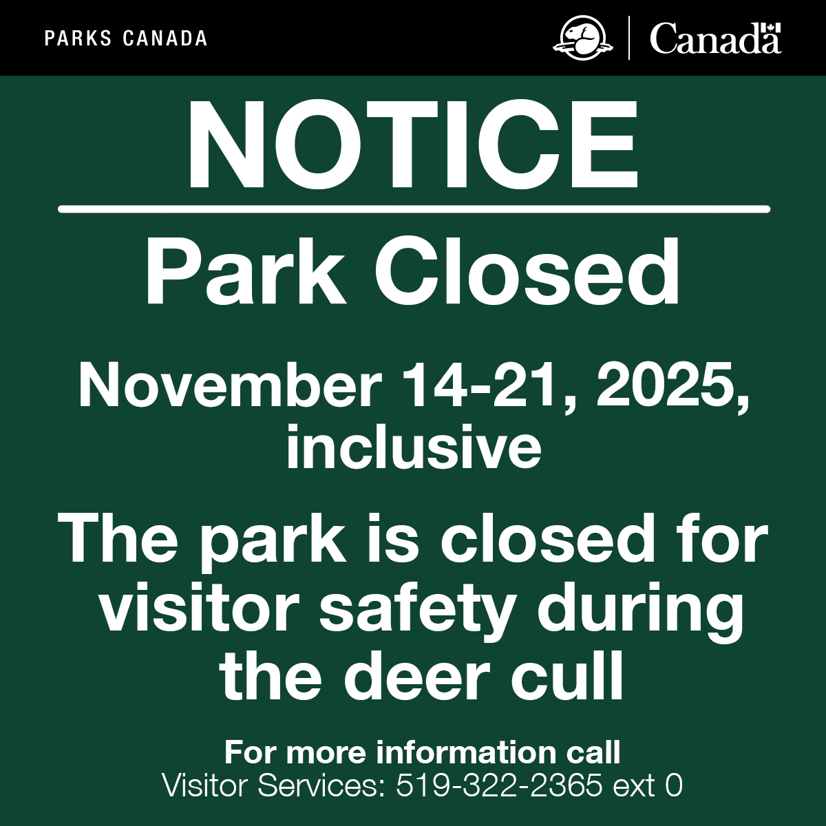 The closure is to allow for Parks Canada and Caldwell First Nation to conduct a deer cull. There is a overabundance of white-tailed deer in the park. The current deer herd population remains higher than what the ecosystem can support and poses a safety risk. All the deer that are culled are given to Caldwell First Nation to use for ceremonial, personal, and traditional use. None of it is sold for profit.
