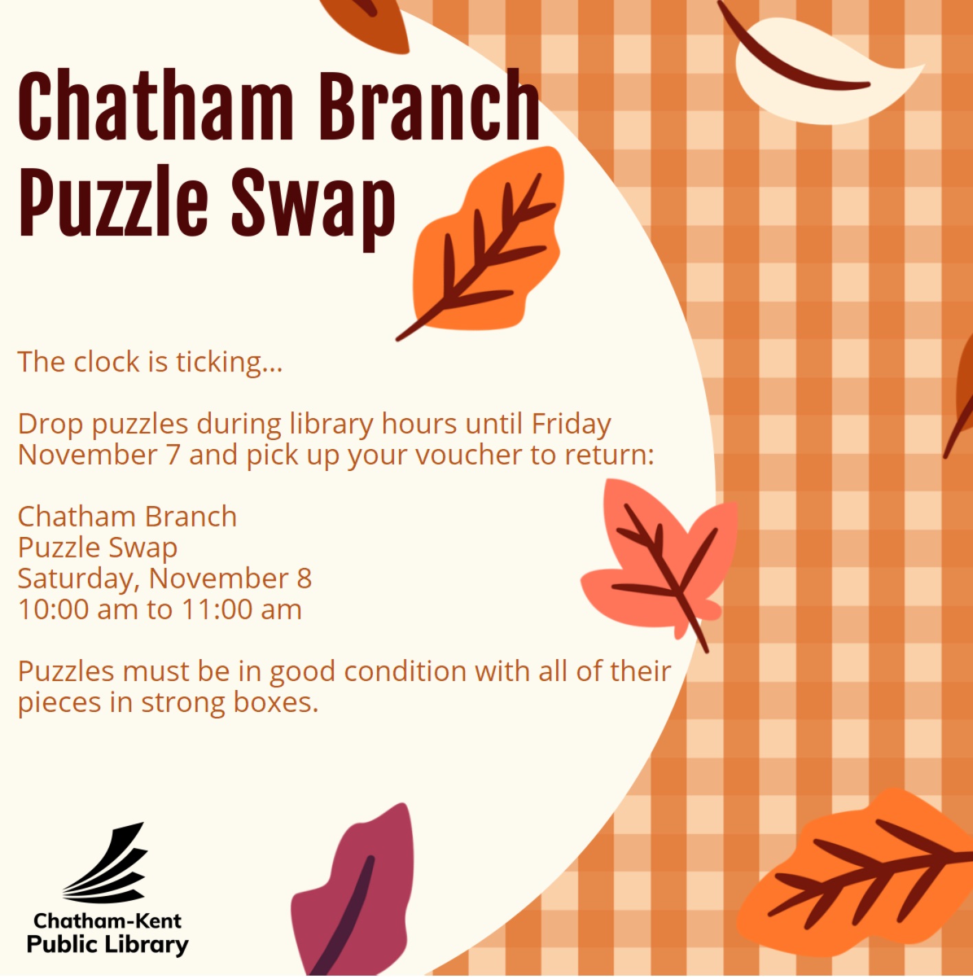 The Chatham Branch of the Chatham-Kent Public Library is hosting a Puzzle Swap.
