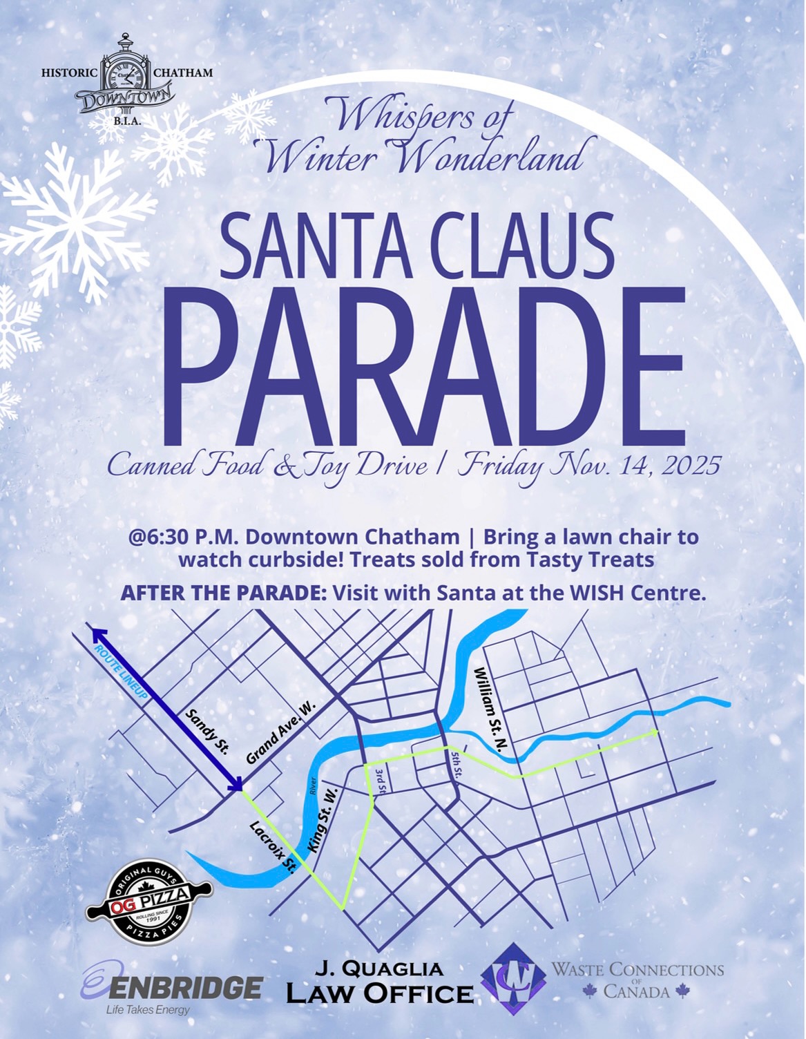 The Downtown Chatham BIA is hosting Santa’s visit on Friday, November 14th. The parade will have a slightly different route this year due to construction. Marshalling on Sandys St., crossing the Lacroix St. bridge, north on Wellington to King St., finishing at the W.I.S.H. Centre beginning at 6:30. Check here for more information.