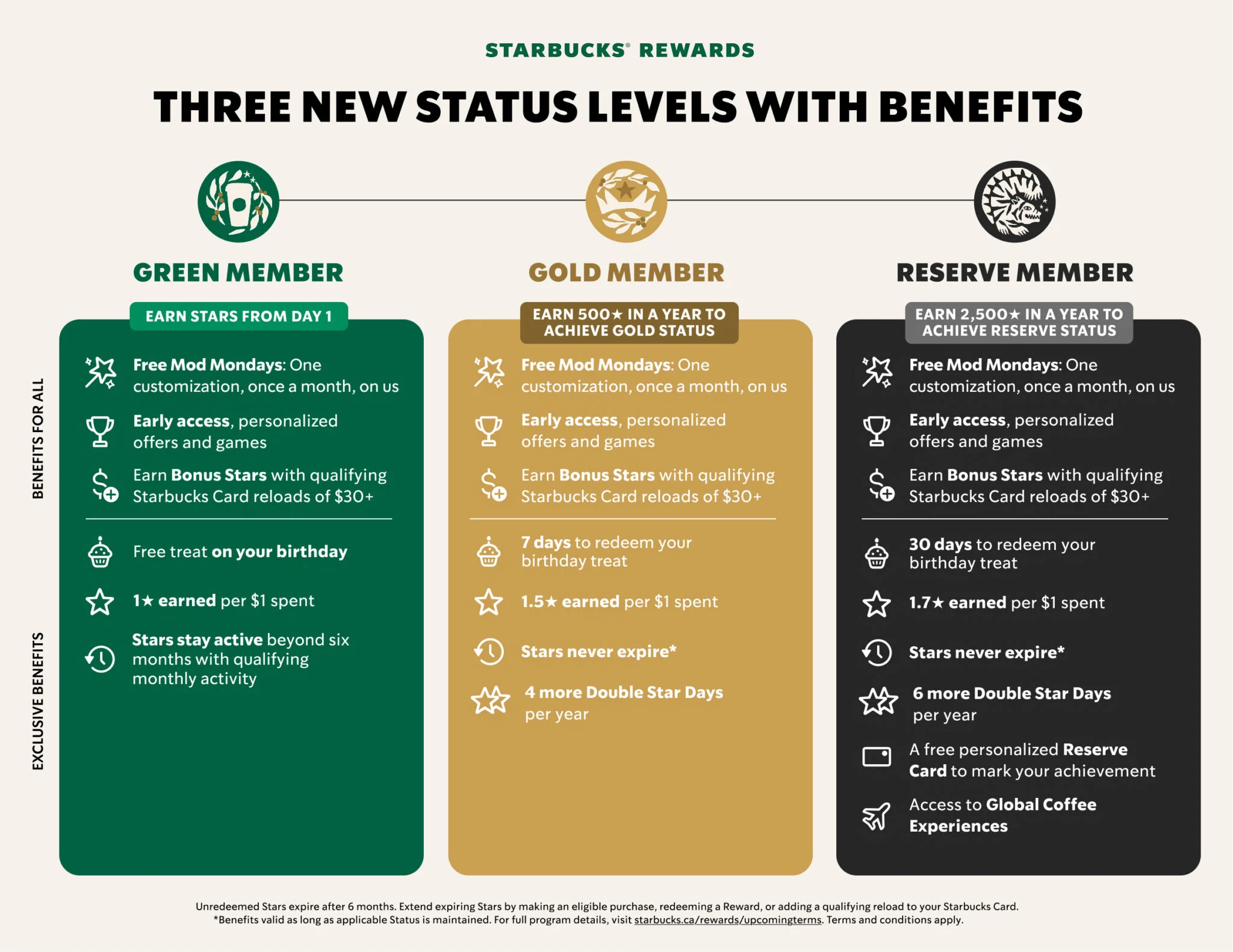 Beginning March 10th, the ‘ll introduce a new three-tier system: Green, Gold, and Reserve, with benefits based on how many Stars customers earn.